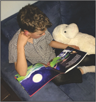 He’s a real kid who was really intrigued and totally unaware we took this pic, because he was so immersed in our children’s book “Adam and the Dinosaurs“.
